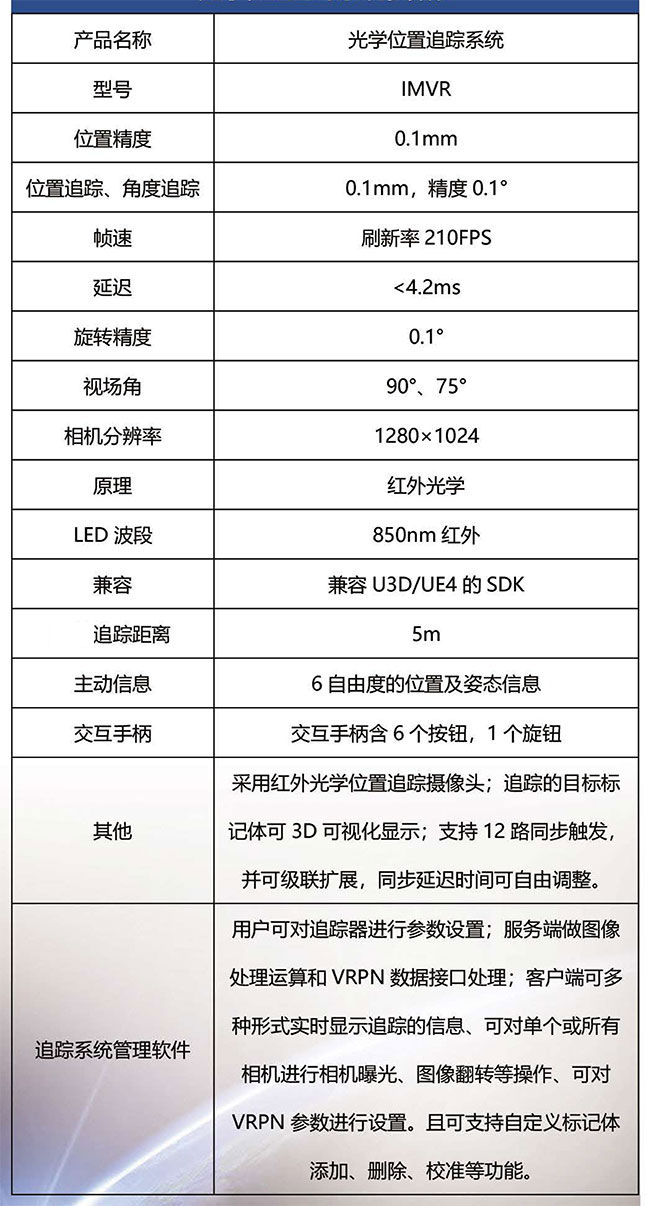 光學位置追蹤系統(tǒng)是專用于大場地、多人互動的虛擬現(xiàn)實光學位置追蹤系統(tǒng),由VR系列智能攝像機、系統(tǒng)調(diào)試軟件、空間標定套件、合作目標套件、游戲引擎SDK包等組成。光學位置追蹤系統(tǒng)可滿足VR空間中人與虛擬場景的交互、人與人的交互、人與現(xiàn)場世界物體的交互,亞毫米級運動捕捉,低延時在4.2ms以內(nèi)。